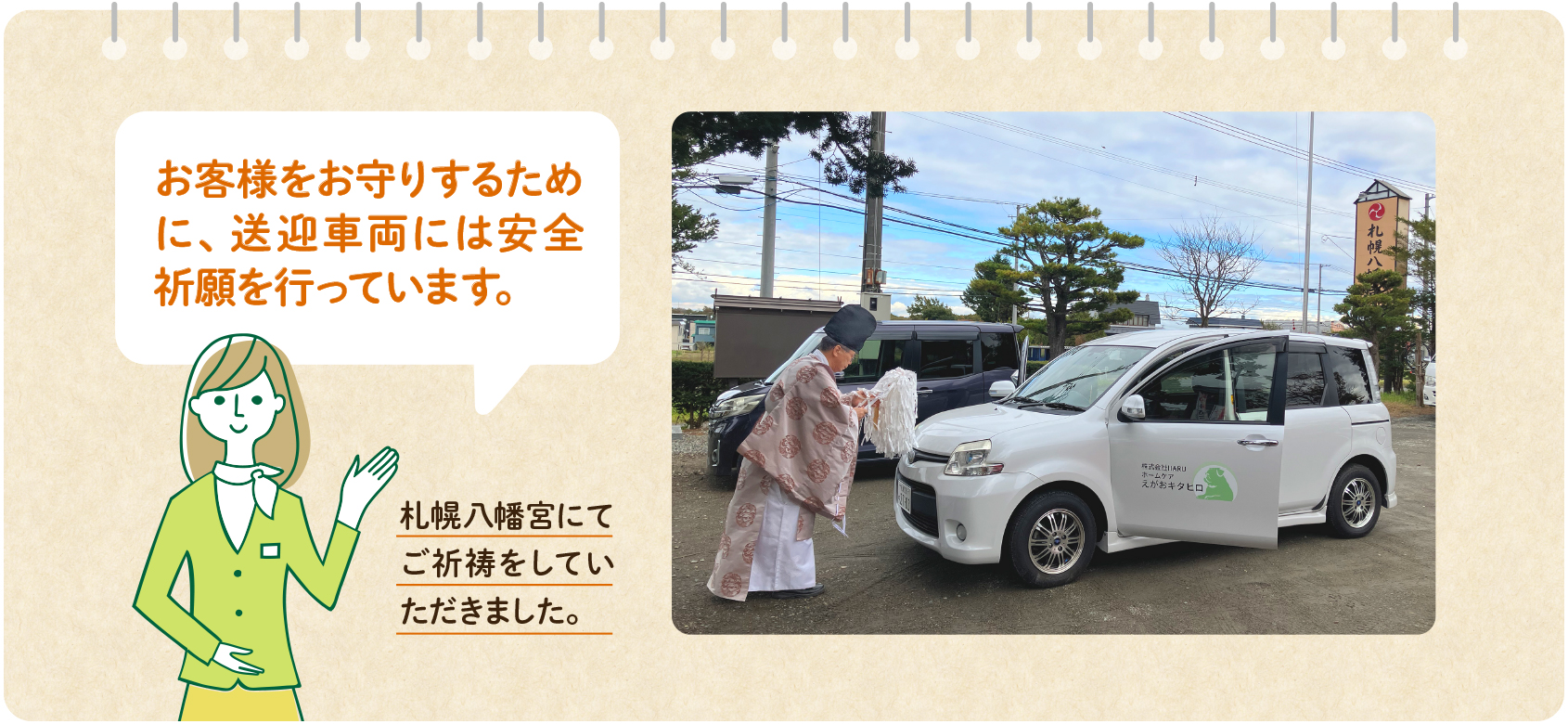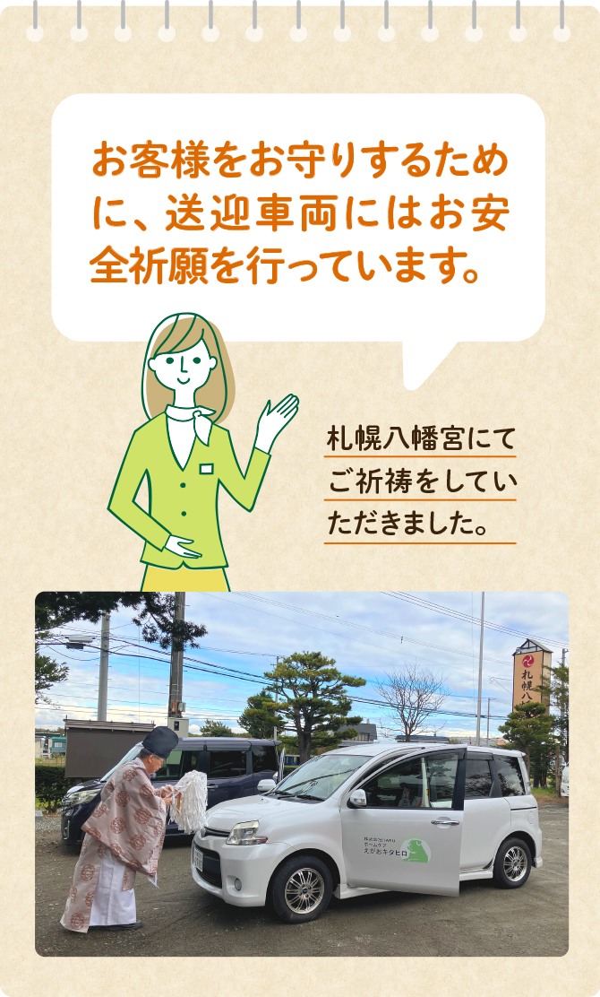 えがおキタヒロでは、介護保険内で行う「通院等乗降介助」、もう1つは利用者様が本当に必要としている支援、例えば「通院」や「日常必需品の買い物」、「お墓参り」や「外食のための送迎」など、介護保険適用範囲の対象外であっても有償でお手伝いさせていただく「有償送迎サービス」がございます。